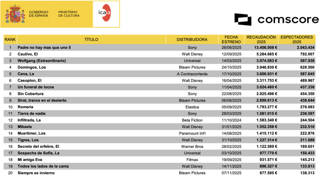 Según el Ministerio de Cultura a través del Instituto de la Cinematografía de las Artes Audiovisuales. Este es el ranking de las 20 películas de cine español más vistas este 2025, elaborado a partir de los datos de Comscore.