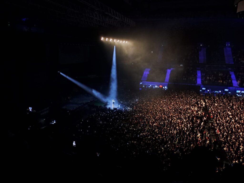Una vez dentro, tras comprar religiosamente el vinilo de su último disco, comenzó la magia. Este concierto, además de ser especial por motivos personales, era mi primera vez en esa arena y algo hizo clic en mi cabeza cuando llegué a mi asiento en la grada. Ver tanto la pista como las gradas llenas confirmaba lo que todos especulábamos en la cola. Mvrk no era ninguna estrella fugaz y cuando se apagaron las luces, el sold out entero comenzamos a gritar YOTMB, el primer tema del show de 2h y 30min.