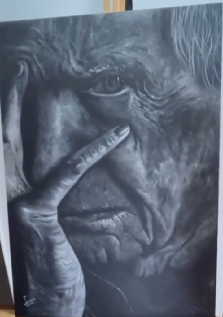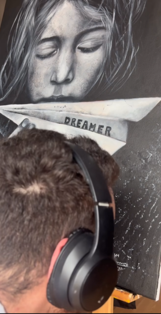 Para Lorenzo, el tiempo no es una presión, sino una herramienta más del proceso creativo. La duración de sus obras varía según la complejidad: mientras algunos lienzos pueden completarse en pocas semanas, los trabajos más elaborados, especialmente retratos realistas, pueden requerir entre tres y cuatro meses.