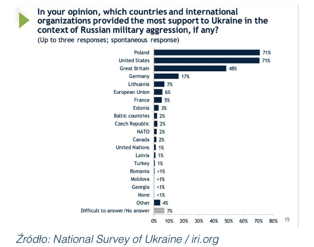 Beyond government actions, ordinary Polish citizens had a significant impact. These people welcomed war victims into their homes, helping them find jobs, raising children together, and living as one family. Many Poles felt responsible for helping their neighbors out of empathy, as well as fear that if Russia won the war, Poland would become its next target. For this reason, various collections were organized and essential items were sent to Ukraine. Currently, many NGOs, such as Adra Polska and Relief for Ukraine, are organizing collections for power generators, which is especially important given the cold winter. This help is recognized by Ukrainians; a study by the International Republican Institute found that 71% of Ukrainians believe Poles are the most instrumental in helping Ukraine fight the Russian aggressor.