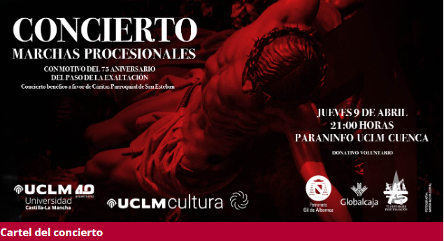 El jueves 9 de abril de 2026, a las 21:00 horas, el Paraninfo Universitario de Cuenca acogerá un emotivo concierto de marchas procesionales con motivo del 75 aniversario del Paso de la Exaltación. El evento, organizado con la colaboración de Globalcaja y el Patronato Universitario “Cardenal Gil de Albornoz”, estará a cargo de la Banda de Música Universitaria del campus de Cuenca, dirigida por Miriam Castellanos. Toda la recaudación obtenida mediante donativo voluntario se destinará íntegramente a Cáritas Parroquial de San Esteban.