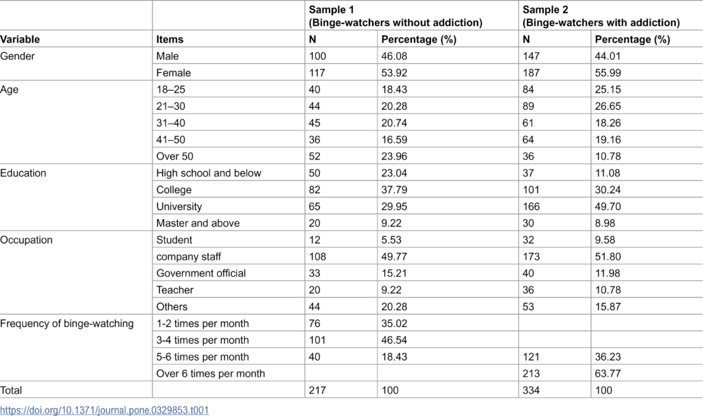 Study was conducted on Chinese individuals who own streaming platforms and watched series for at least 3.5 hours straight and more than 4 episodes at a time per week. Measurement of addiction was based on the use of questionnaires: the Problematic Series Watching Scale, the Motivation for Watching TV Series, and a 6-item UCLA Loneliness Scale.